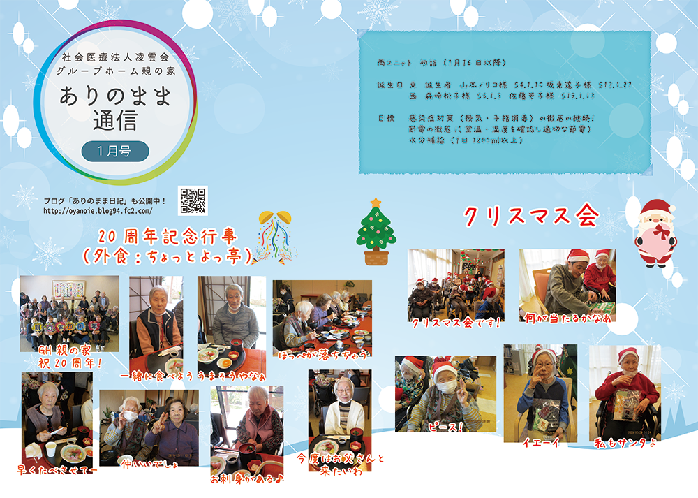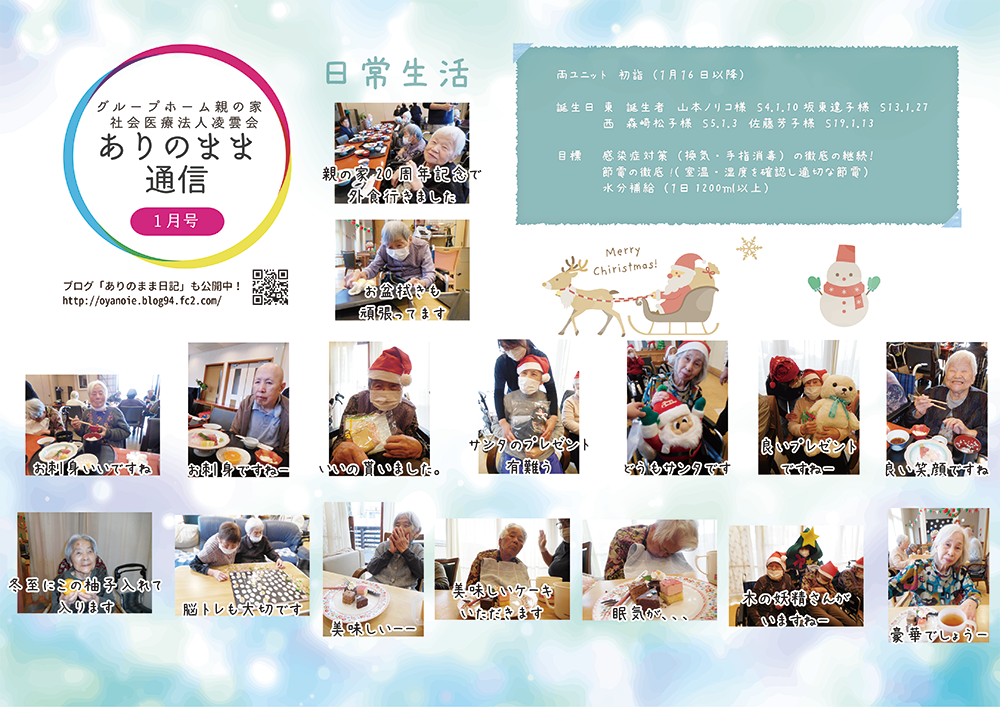 毎月一回発行している、主に親の家での行事やイベントを紹介する通信です。ご家族の方やホームページをご覧の方に日頃の様子を知ってもらえたらという思いで作っています。